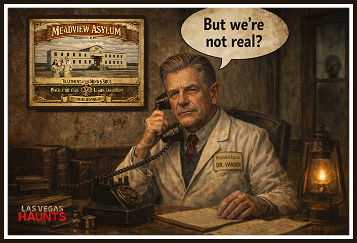 “But what about Dr. Vander?” the production manager asked, “…we read it on your website!”. I had to explain, “We made it up! It’s just a story!” Fortunately, we did have connections in the industry, so we called Eastern State Penitentiary in Philadelphia and hooked them up! One of the very first Ghost Hunter TV programs ever filmed in the US was supposed to be Meadview Asylum in Las Vegas! How is THAT for an Easter Egg?